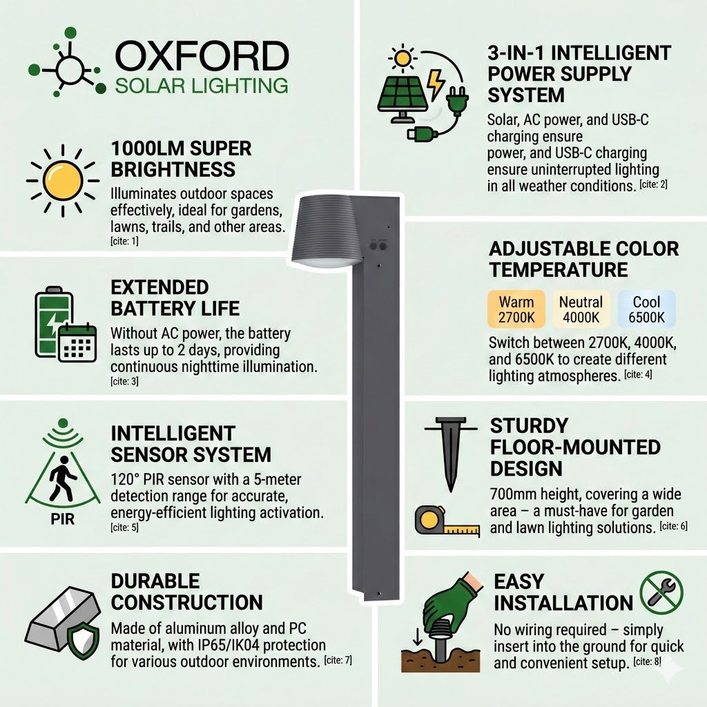 The powerhouse of the pathway. The SGL-21LA is a '3-in-1' light, capable of being powered by the sun, USB-C, or even AC power for those particularly dark winter months. Standing at a proud 700mm, it delivers a massive 1000 lumens of light—perfect for long driveways or large commercial gardens. Constructed from professional-grade aluminium alloy and PC material, it’s designed to withstand the harshest UK frost and wind while providing year-round reliability."